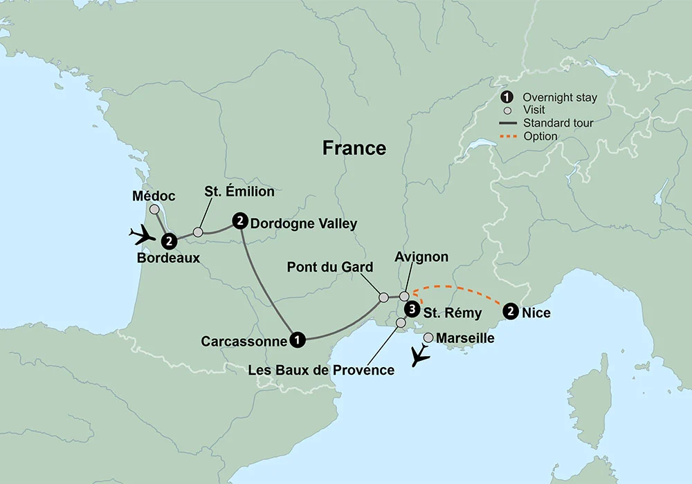 Allons-y! You’re on your way to Bordeaux and the Dordogne Valley, two of the world’s most renowned wine regions, before it’s on to chromatic Provence.