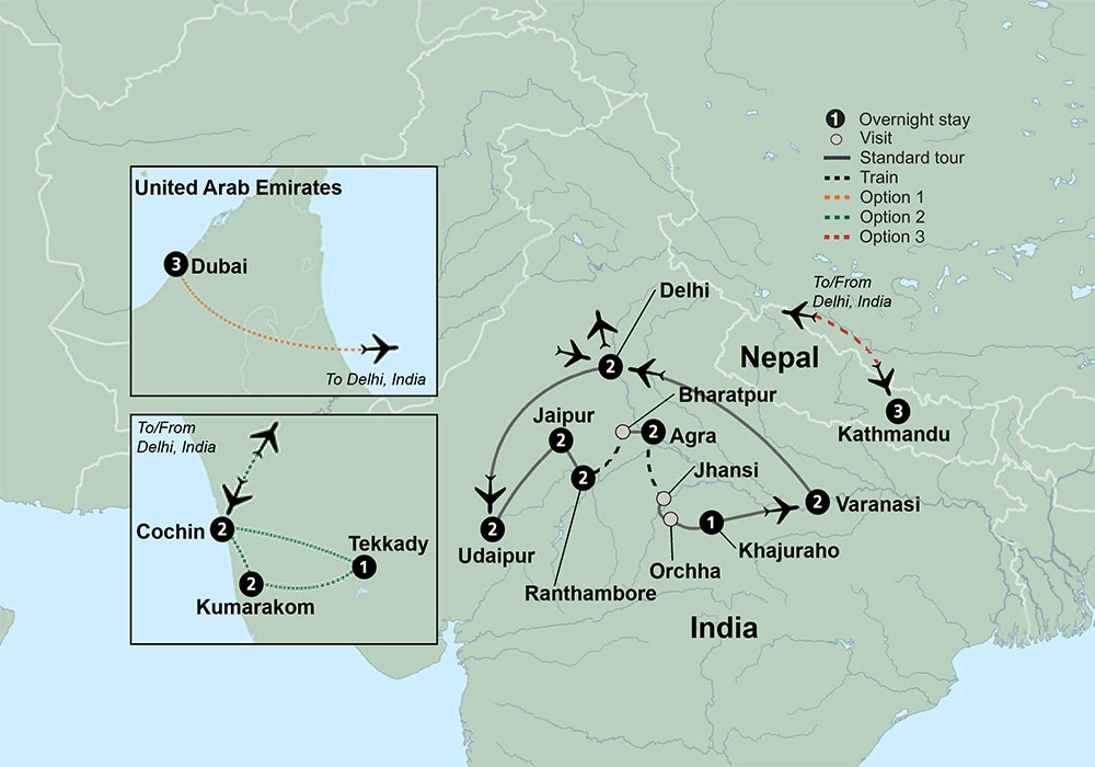 The Taj Mahal, temples and tigers – experience all the spice of India on this comprehensive tour. Explore Old Delhi’s historic streets by rickshaw. See the Taj Mahal bathed in the light of sunrise. Embark on an evening cruise across Lake Pichola. Enjoy magnificent views of the Jag Mandir Palace. Participate in a cooking demonstration, try your hand at sari tying, even get a henna tattoo! See the City Palace in Jaipur. Experience two game drives in Ranthambore National Park. Visit the site of Buddha’s first sermon. Take an early morning ride on the holy River Ganges. Discover the many ways in which this mysterious land dazzles the senses.